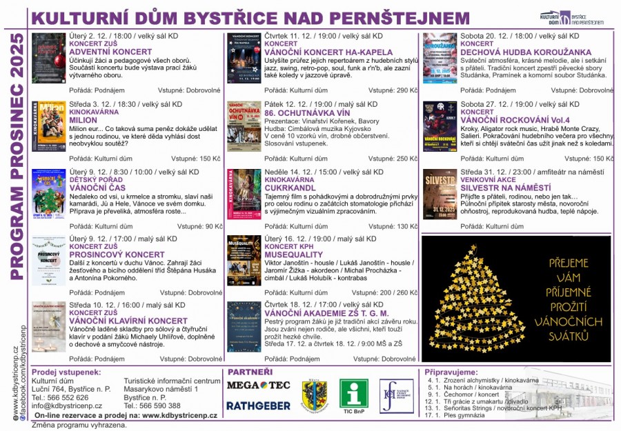 Adventní čas je tu, a proto nabízíme několik příležitostí, jak se na sváteční vlnu naladit. Začínáme v úterý 2. 12. Adventním koncertem Základní umělcké školy v 18:00, na kterém se představí všechny obory, včetné výstavy výtvarného oboru. Následující den od vánoční tématiky ještě odbočíme, a to kinokavárnou Milion 3. 12. v 18:30. Následně se k tématu vrátíme 11. 12. Vánočním koncertem Ha-Kapely, kde uslyšíte nejen jazzové koledy, ale také výběr z repertoáru z žánrů swing, soul, retro-pop, r'n'b a dalších od 19:00. V prosinci nás také čeká v pátek 12. 12. Vánoční (86.) ochutnávka vín se slosováním vstupenek o ceny. Poslední kinokavárnou v letošním roce je pro Vás 14. 12. připraven rodinný film Cukrkandl v 15:00. Zbytek měsíce naleznete na webových stránkách, Facebooku.